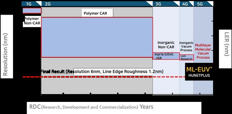 Hunet Plus 的 ML-EUV® 透過其專有的 Organic–Inorganic Molecular Layer Deposition Process®——一種創新的乾式分子層堆疊方法,利用有機前驅體和無機前驅體在分子層面形成10-20奈米超薄多層光阻薄膜,從而實現了10奈米以下的超高解析度和2奈米以下的線邊緣粗糙度的世界級性能。